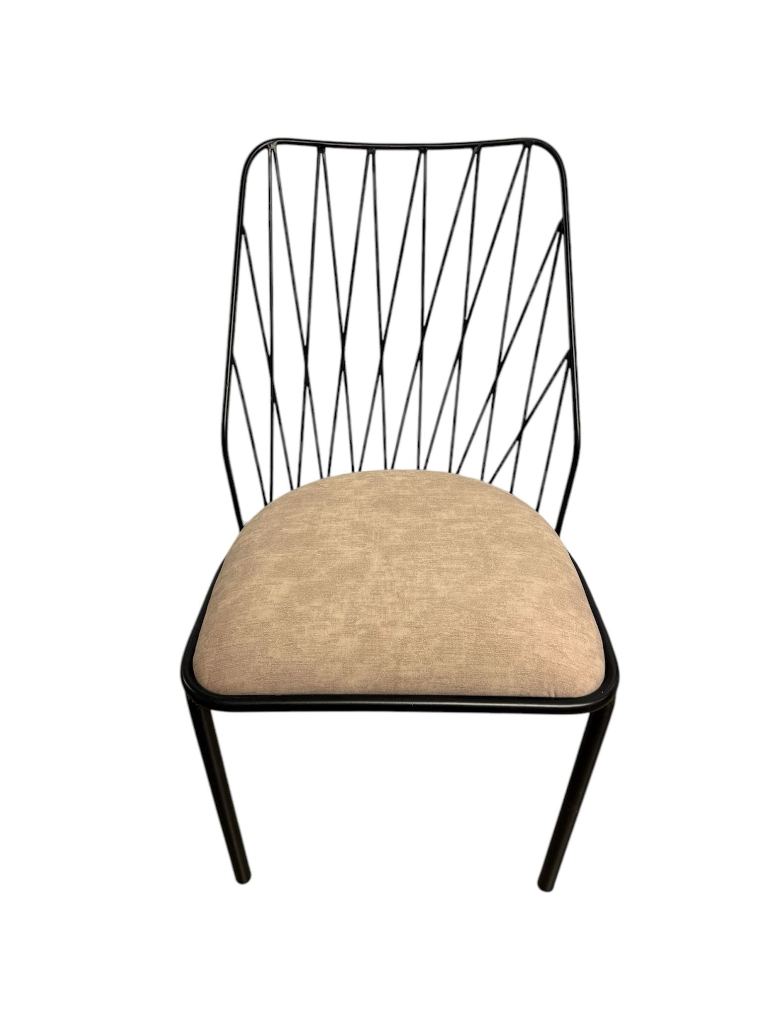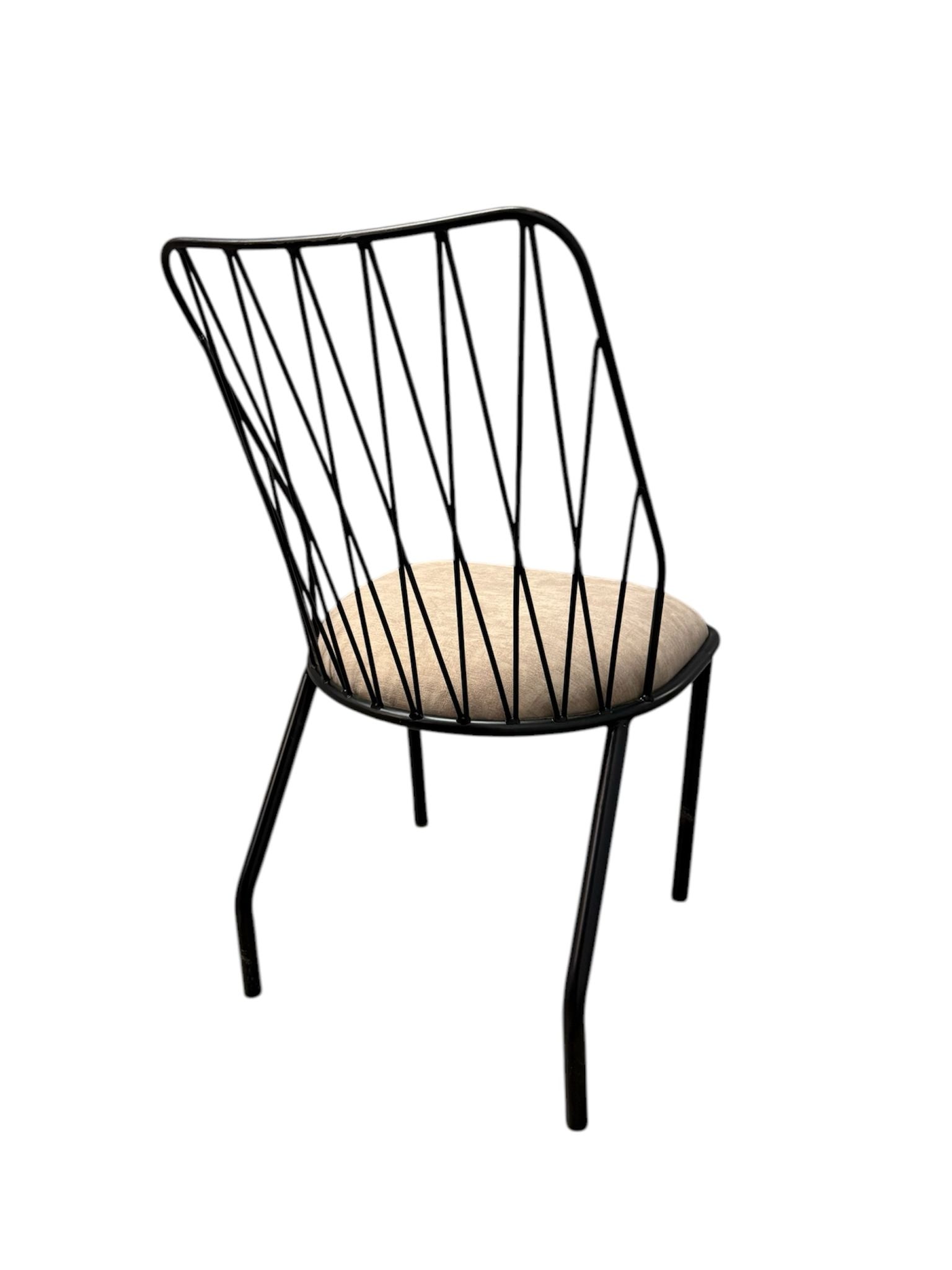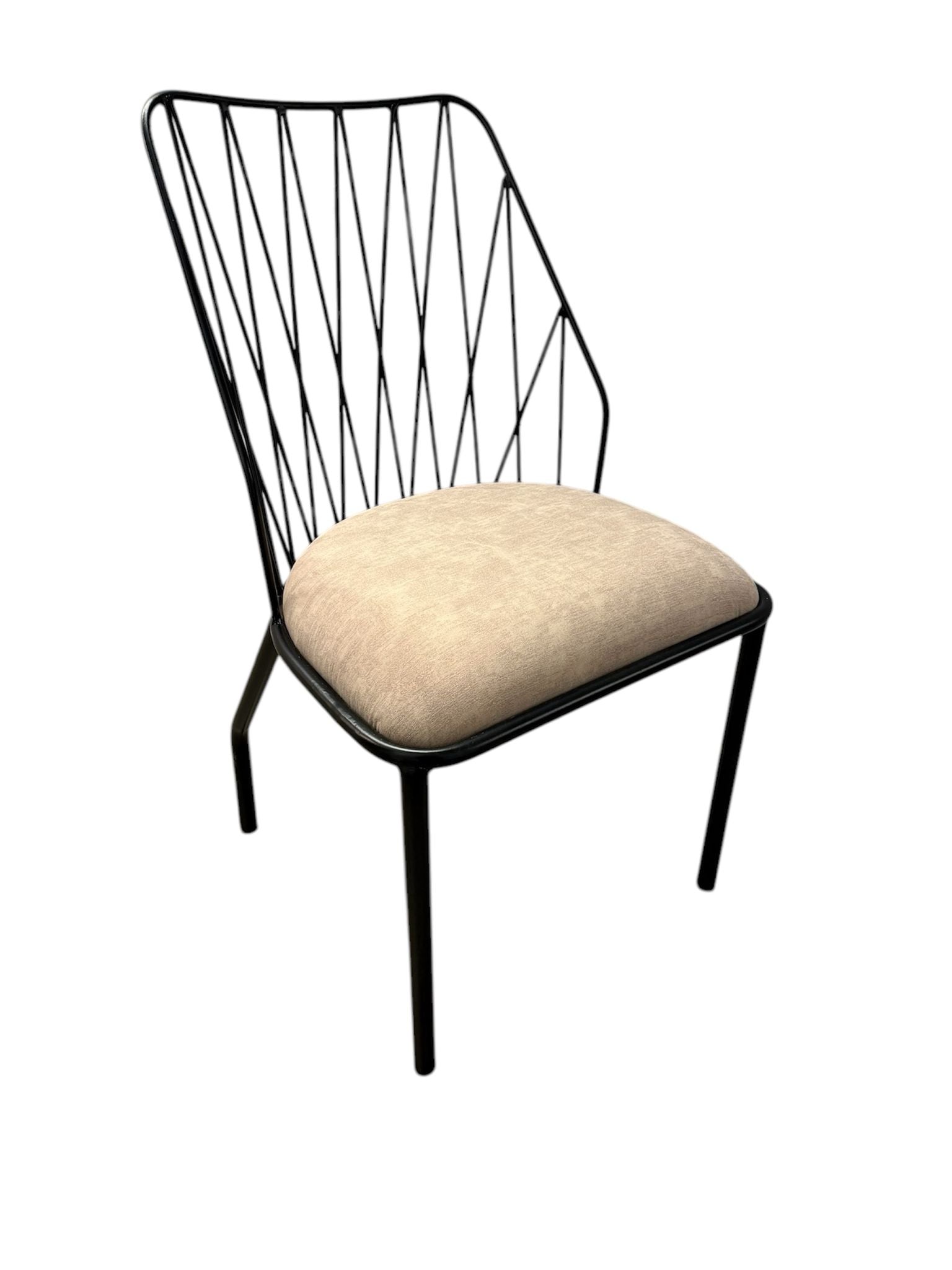 Teak Wood Live Edge Dining Table in Natural Finish with Black Iron Base and six (6) Cushioned Iron Based Chairs.